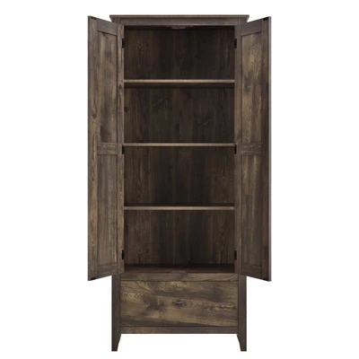 The Room & Joy Brookside 30” Wide Storage Cabinet is a stylish way to stay on top of your organization. The rustic barn style design and sleek tapered feet gives the look of an old weathered cabinet but the sturdy laminated particleboard and MDF make this cabinet the perfect piece to house your home office supplies, extra linens, seasonal clothing, nonperishable food and more! Open up the two doors to 4 shelves, 3 adjustable, to fit items of differing sizes. The bottom drawer is finished in a clean linen-look paper and metal slides for a smooth gliding drawer. The Brookside Cabinet is recommended to be assembled and moved by 2 adults. A wall anchor kit is provided for extra safety and security. After assembled, this cabinet measures to be 71.89”H x 29.69”W x 15.67”D.