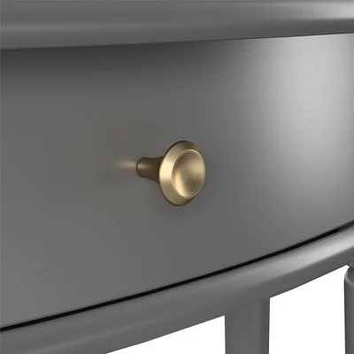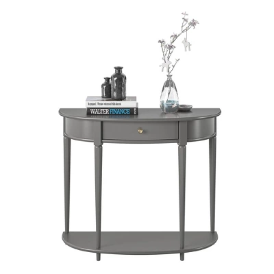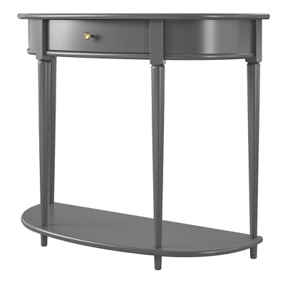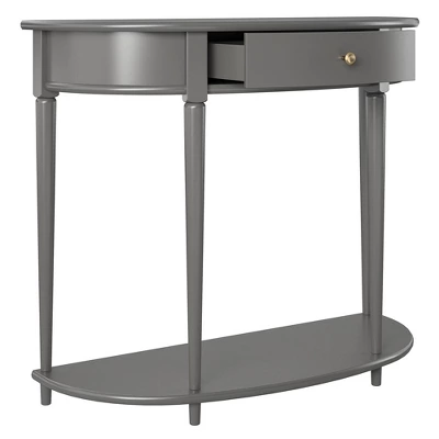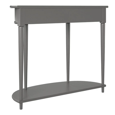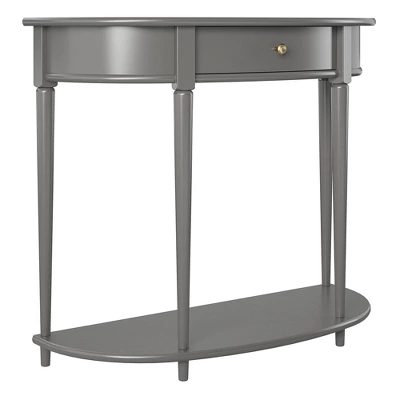 Give your living room or entryway a glow-up with a beautiful new Half-Moon Console Table. The classic elegance of the half-moon top and tapered legs create a vintage yet sophisticated feel perfect for any décor. This half-moon Console Table features a spacious drawer to keep clutter out of sight and a lower shelf for books, photos, or other decorative items to cozy up the room. Made sturdy painted MDF, the Console Table is as durable as it is affordable and assembly is a snap! With the preassembled tabletop and drawer all ready to go right out of the box, just attach the legs and bottom shelf, and you’re off to more important things, like basking in the ambiance of a well decorated room. Complete the look with the entire collection. The Console Table ships flat to your door in one box. Assembly is required. Two adults are recommended to assemble. Once assembled, the Console Table measures to be 35.9″ W x 14″ D x 30″ H.