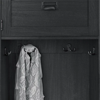 Create an inviting entrance into your home with the Room & Joy Brookside Entryway Hall Tree with Storage Bench. Drawer provides space to store away shoes or blankets and features durable metal slides and store away hats and scarves behind the top door or hang them along with coats and bags on the 4 metal hooks. The woodgrain finish on the laminated MDF and particleboard along with the rustic barn style design give the Entryway Hall Tree rustic charm. The bench can support 200lbs. and each hook will hold 5lbs. Space behind the door and the drawer each holds 15lbs.
