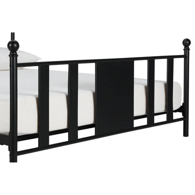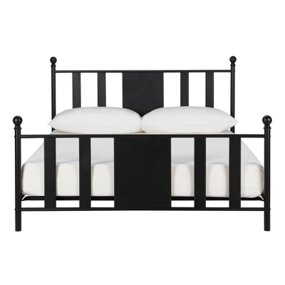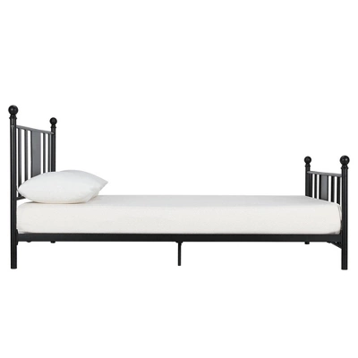 Bring a fused classical and contemporary charm to your bedroom with the Room & Joy Lisa Metal Bed. This unique bed features a stunning frame designed with one of a kind black rectangular strips on both its headboard and footboard. This bold luxurious detailing is guaranteed to make a real statement to your bedroom. The black metal frame is both sturdy and durable, providing you comfort for years to come. No need to buy a box spring or additional foundation as this carefully crafted bed frame requires only a mattress (sold separately). Dress up the bed with your favourite throw pillows and blankets or keep it simple with light toned bedding. Ships in one box for stress-free handling and easy to assemble. The Lisa Queen Metal Bed can support up to 500lb. Available in full and queen sizes to suit your space. Treat yourself with a well deserved stylish and comfortable bed.