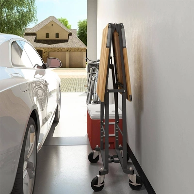 Take the Room & Joy Portable Folding Workbench anywhere the work is. When your work is done, simply fold and store away. Made with industrial-strength steel, this utility table has a weight capacity of 400 pounds on the Hardwood top shelf. The two locking casters allow you to keep it in place while you work. Folds in seconds, saving you time and storage space. With plenty of leg room under the desk top and a large working surface, this versatile work desk is ready to handle any DIY project.