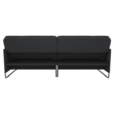 The Room & Joy Prescott Convertible Futon is modern and bold with a mix of solid colors and metal accents. Upholstered in linen fabric, this sofa bed comes with upholstered armrests, individual seat cushions and a thick padding. What is captivating about this futon is the split-back design seating that can be lowered independently into lounging or sleeping position, allowing guests to fully adjust how they wish to sit to perfectly reflect their comfort level. The Prescott futon provides a comfortable sleeping space when fully opened and thanks to its sturdy wood frame and metal side legs, this futon offers ample and sturdy support day or night.