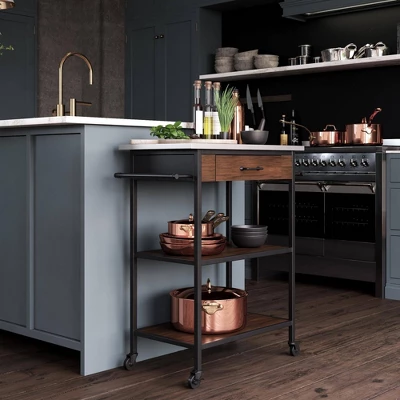 Running out of counter space and don’t know where to put your smoothie blender and mini-food processer? We hear you! The DHP Kane Kitchen Cart was designed to be the go-to organizer to help you tackle your kitchen chaos. Compact enough to fit in small kitchen or dining areas, the Kane displays modern rustic elements such as a dapper stainless steel counter top, rich brown wood paneling, and a metallic black frame. Basically an extension of your kitchen on wheels, its easy glide lockable casters let you move everything you need for meal prep closer to your stove so you don’t have to run around to find that vital spice blend your recipe so duly requires. With an upper drawer, 2 lower shelves, and 2 side towel bars, you have all the storage space you could ask for in one self-contained unit so your pantry staples, dinnerware, and cookware will finally have a dedicated home.