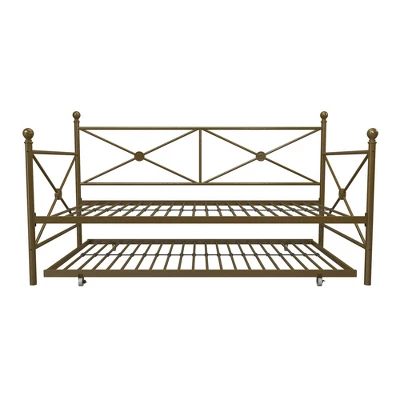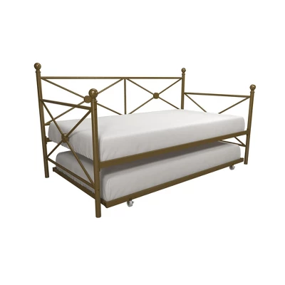 Optimize your living space with the Room & Joy Laura Daybed and Trundle as it comes with an ultra-chic design and great functionality. This metal bedframe features an elegant design with crisscross metal, highlighted with a circular medallions and round finial posts. Built with a sturdy frame, this daybed comes with secured metal slats that ensure stability and durability. Having guests stay over? This piece includes a trundle that rolls out and creates yet another bed! Accompany it with some duvets and soft throw pillows, and it will be converted into a comfy lounging for your living room. Available in classic black and gold, the Laura Daybed and Trundle will compliment any interior.